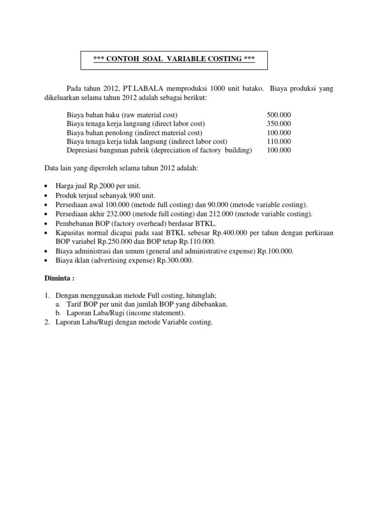 Dari data di atas, maka hitunglah hpp menggunakan variable costing dan sajikan dalam laporan laba rugi: